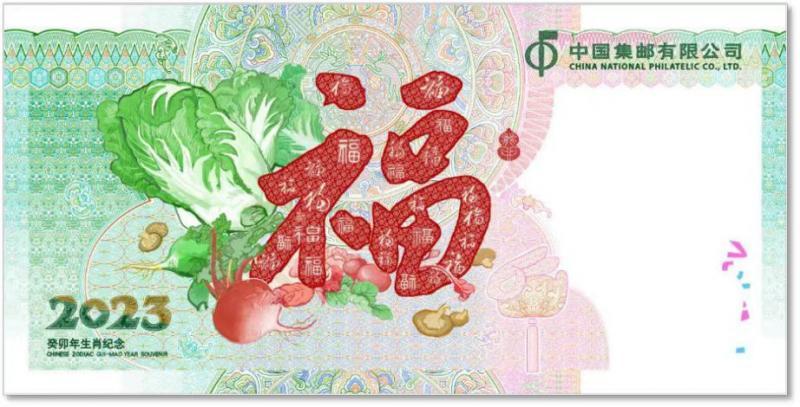 紀(jì)念券背面主景采用多個(gè)“?!弊值慕M合,寓意著新的一年福氣連連、福滿門。背景團(tuán)花中有玉兔搗藥的圖案,表達(dá)了疫情之下祈求健康、幸福的真摯愿望。白菜、蘿卜、蘑菇也都有著各自的深意,比如白菜諧音“百財(cái)”,且有清白之意;蘿卜在閩南方言叫“菜頭”,諧音彩頭;蘑菇則象征蓬勃向上的生命力量。這些看似普通的元素給人以親切之感,更寓意著源源不斷的財(cái)運(yùn)、好運(yùn)和幸運(yùn)。