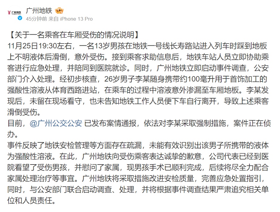 廣州地鐵方面表示,事件反映了地鐵安檢管理等方面存在疏漏,未能有效識(shí)別出該男子所攜帶的液體為強(qiáng)酸性溶液,向受傷乘客表達(dá)誠(chéng)摯的歉意。廣州地鐵公司代表已經(jīng)到醫(yī)院看望了受傷男孩,并慰問了家屬,現(xiàn)男孩手術(shù)已順利完成,后續(xù)將盡全力配合家屬處理治療等事宜。