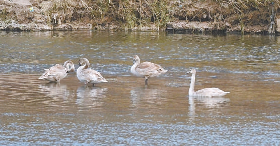 四只疣鼻天鵝幼鳥(niǎo)活動(dòng)在河畔淺灘。 吳嵐攝