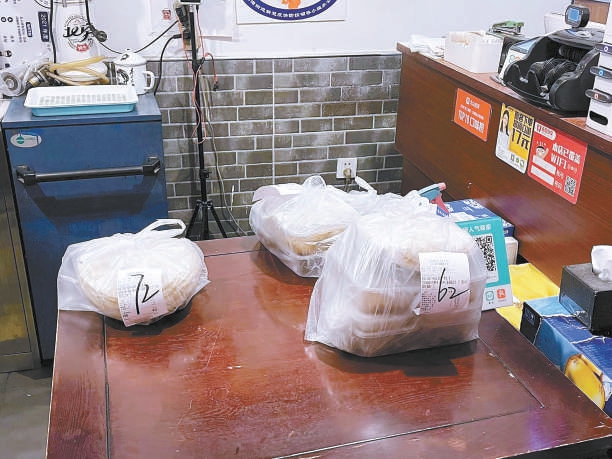 但在龍?zhí)督值酪患掖猴灥辏浾攥F(xiàn)場看到,春餅外賣只是被服務員套上塑料袋并簡單系了個結(jié),放到門口的桌子上等外賣員來取,沒有貼外賣封簽,更沒有有效的密封措施。