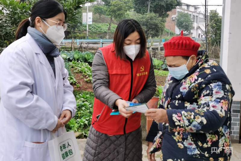 各個(gè)鎮(zhèn)組織村干部與醫(yī)護(hù)人員給農(nóng)村老人送上健康包(央廣網(wǎng)發(fā) 渝北區(qū)融媒體中心供圖)