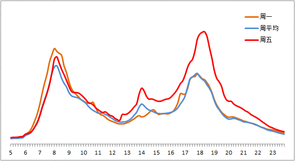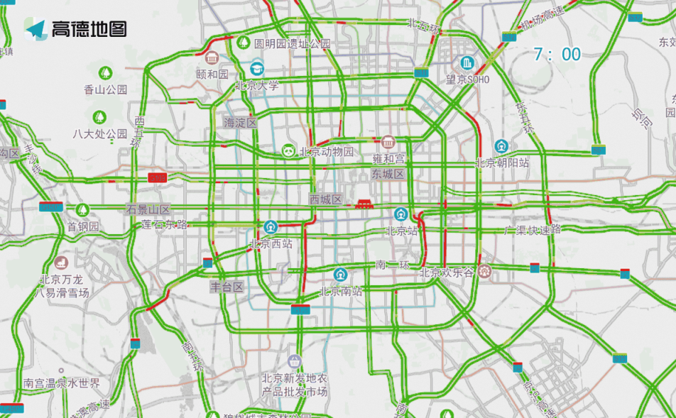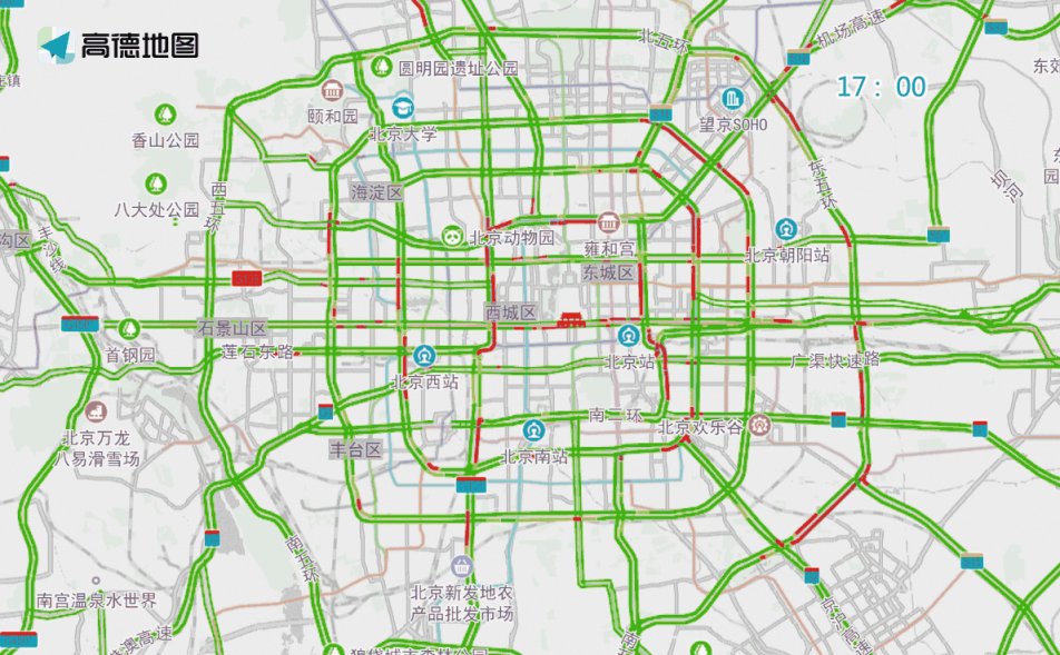 晚高峰期間,東、西、北二、三、四、五環(huán),東六環(huán)部分路段,以及萬泉河路至圓明園西路、通惠河北路、蓮石東路等城區(qū)道路出城方向車流集中,京藏高速、京承高速、京通快速、京港澳高速、機(jī)場高速等高速公路出京方向?qū)⒊霈F(xiàn)高峰車流,高峰時(shí)段為17:00—19:00,周五晚高峰提前且持續(xù)時(shí)間較長。