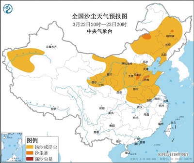 中央氣象臺昨日18時繼續(xù)發(fā)布沙塵暴黃色預警,受冷空氣大風影響,預計22日20時至23日20時,新疆西南部、內(nèi)蒙古中西部和東南部、青海東北部、甘肅中部、寧夏、陜西中北部、山西、河北中南部、北京南部、天津中南部、山東、河南、安徽中北部、江蘇中北部、湖北北部、黑龍江中西部、吉林中西部、遼寧等地的部分地區(qū)有揚沙或浮塵天氣,其中,內(nèi)蒙古中部偏北地區(qū)、黑龍江南部、河北西南部、山東西部局地有沙塵暴。