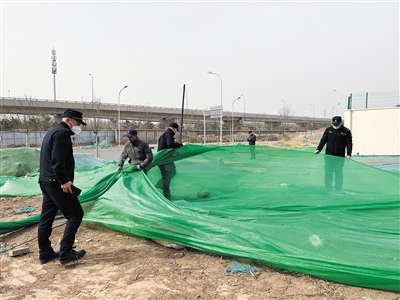 3月22日,石景山古城街道綜合行政執(zhí)法人員來到轄區(qū)內(nèi)工地,要求施工單位對裸露地面、渣土堆放場所及時苫蓋,施工期間進行灑水降塵,渣土運輸車輛確保清潔到位上路不遺撒,從源頭杜絕揚塵污染源的發(fā)生。新京報記者 浦峰 通訊員 王亞楠 攝
