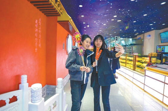 在位于朝外附近的北京稻香村零號(hào)店新店內(nèi),顧客在充滿古都元素的紅墻金瓦前打卡留影。 本報(bào)記者 武亦彬攝