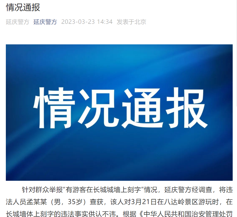 央廣網(wǎng)北京3月23日消息 據(jù)延慶警方微信公眾號3月23日情況通報, 針對群眾舉報“有游客在長城城墻上刻字”情況,延慶警方經(jīng)調(diào)查,將違法人員孟某某(男,35歲)查獲,該人對3月21日在八達(dá)嶺景區(qū)游玩時,在長城墻體上刻字的違法事實供認(rèn)不諱。根據(jù)《中華人民共和國治安管理處罰法》有關(guān)規(guī)定,延慶警方已對孟某某處以行政拘留并處罰款的處罰。