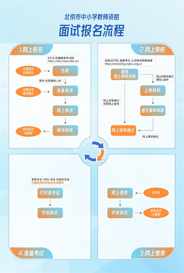 報考面試流程為:網(wǎng)上報名→網(wǎng)上審核→網(wǎng)上繳費→查詢準考證→參加面試→查詢成績。
