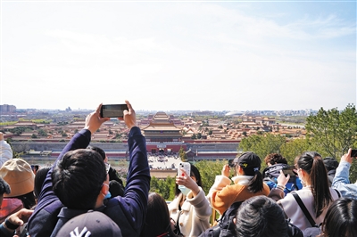 3月26日,景山公園,游客眺望遠處故宮拍照打卡。新京報記者 王飛 攝