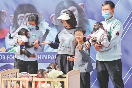 16日,北京野生動物園在萌寶幼兒園戶外展區(qū)組織“明猩見面會”活動,邀約忠實(shí)粉絲與四只小黑猩猩互動合影。本報記者 鄧偉攝