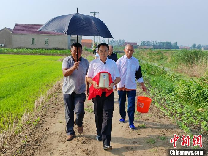 7月9日晨,劉德文手捧去臺(tái)老兵唐步良的骨灰,準(zhǔn)備將其安葬在江蘇鹽城市射陽縣興橋鎮(zhèn)青華村青華公墓。這里是唐步良父母的長(zhǎng)眠之地?!≈行律缬浾?谷華 攝