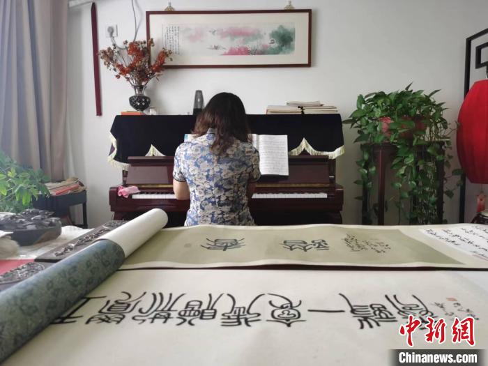 近日,楊玉如練完字后彈奏鋼琴?!≈行律缬浾?鐘升 攝