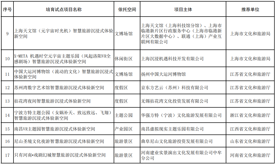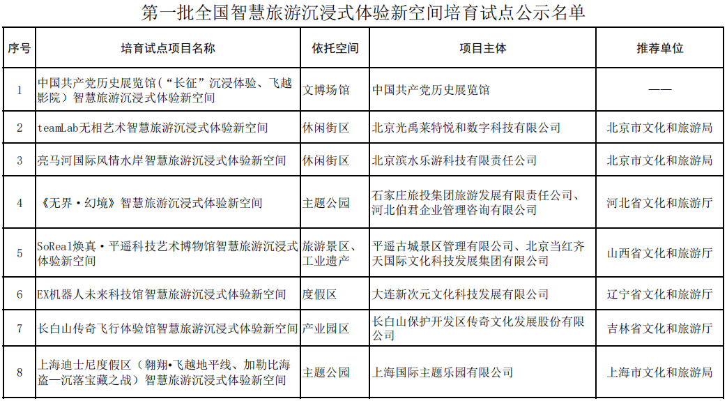 名單顯示,中國(guó)共產(chǎn)黨歷史展覽館(“長(zhǎng)征”沉浸體驗(yàn)、飛越影院)智慧旅游沉浸式體驗(yàn)新空間、teamLab無相藝術(shù)智慧旅游沉浸式體驗(yàn)新空間、亮馬河國(guó)際風(fēng)情水岸智慧旅游沉浸式體驗(yàn)新空間等24個(gè)項(xiàng)目在列。
