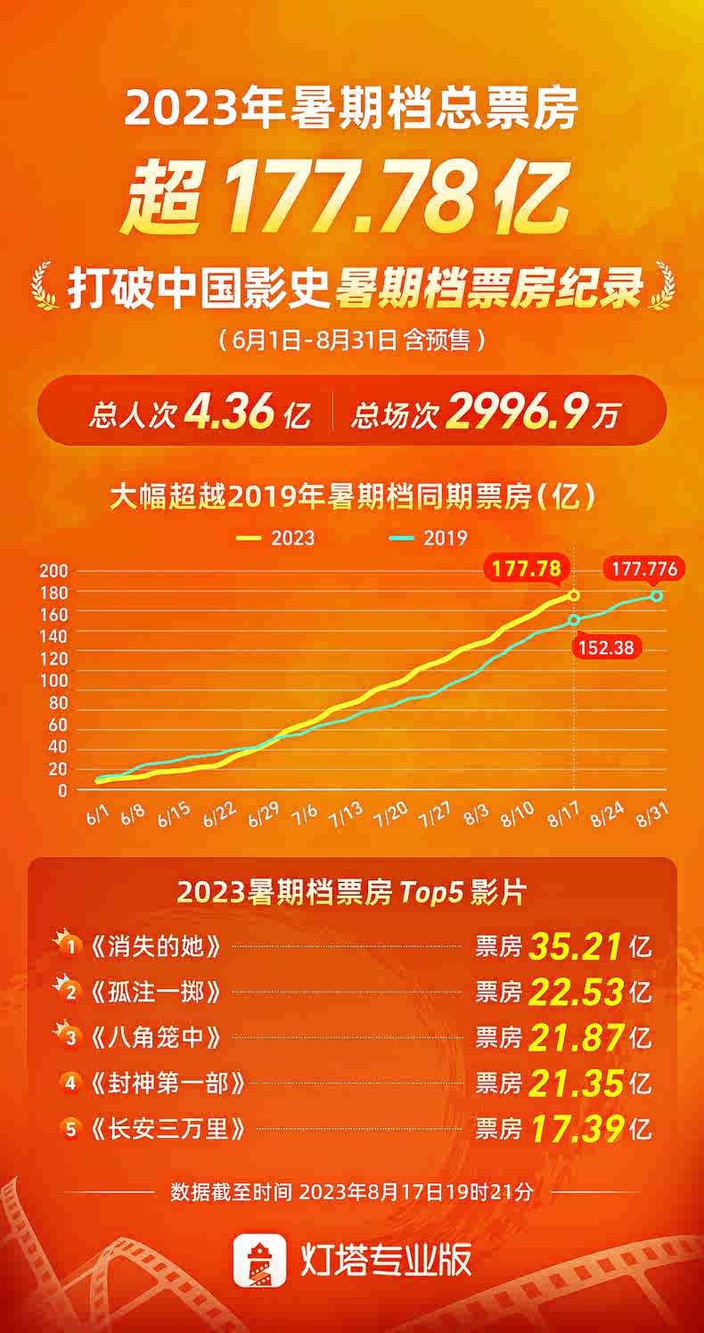 央廣網(wǎng)北京8月17日消息 據(jù)燈塔專業(yè)版數(shù)據(jù),截至8月17日19時(shí)21分,2023年暑期檔總票房超177.78億,打破中國影史暑期檔最高票房紀(jì)錄,目前距離暑期檔結(jié)束還有14天。