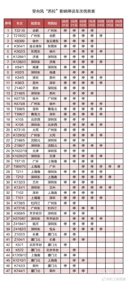 記者從中國(guó)鐵路上海局集團(tuán)有限公司獲悉,受第9號(hào)臺(tái)風(fēng)“蘇拉”影響,為確保列車運(yùn)行安全,鐵路部門計(jì)劃對(duì)杭深線、京港高鐵、廣深城際、廣深港高鐵、穗深城際、京九線等線路運(yùn)行的部分列車采取停運(yùn)措施。截至30日17時(shí)30分,計(jì)劃停運(yùn)8月31日至9月6日間共121趟旅客列車:其中停運(yùn)動(dòng)車組列車74趟,停運(yùn)普速列車47趟。