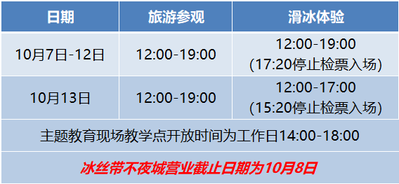 10月7日至10月12日,旅游參觀和滑冰體驗(yàn)開放時(shí)間為12:00-19:00,滑冰體驗(yàn)停止檢票入場(chǎng)時(shí)間為17:20。