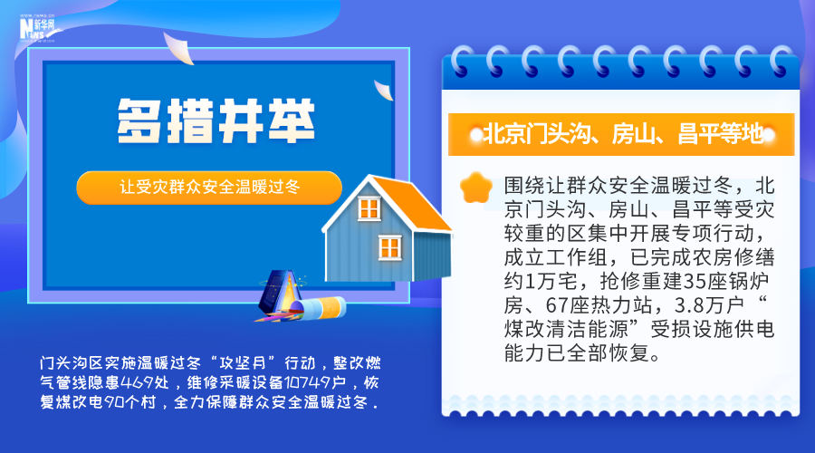 圍繞讓群眾安全溫暖過冬,北京門頭溝、房山、昌平等受災(zāi)較重的區(qū)集中開展專項(xiàng)行動,成立工作組,已完成農(nóng)房修繕約1萬宅,搶修重建35座鍋爐房、67座熱力站,3.8萬戶“煤改清潔能源”受損設(shè)施供電能力已全部恢復(fù)。