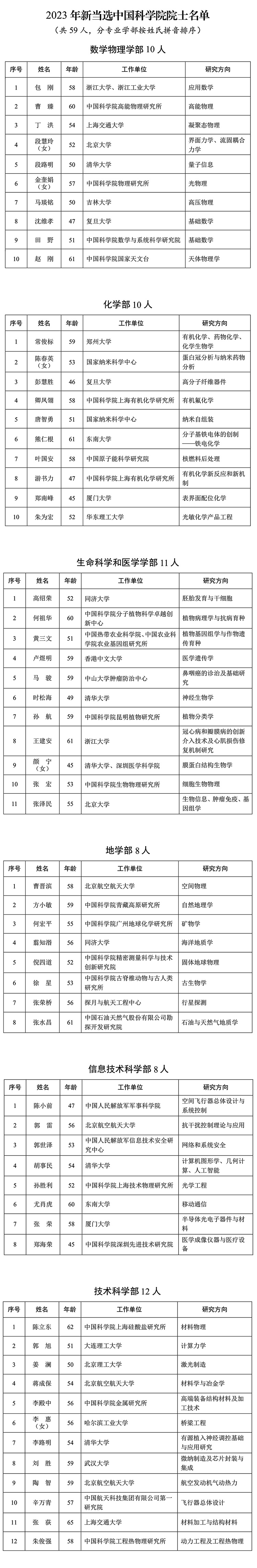 2023年新當選中國科學院院士名單