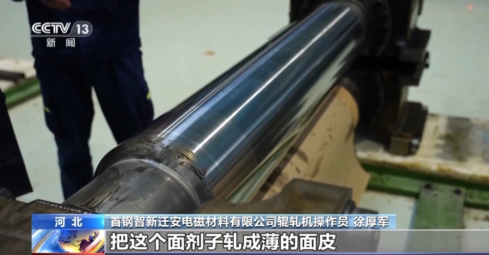 首鋼智新遷安電磁材料有限公司輥軋機(jī)操作員 徐厚軍:這就是軋制和帶鋼直接接觸的工作輥,如果說(shuō)家里搟面的話,這就是我們的搟面杖。那個(gè)鋼鐵材料就相當(dāng)于面劑子,我們就用這個(gè)搟面杖,通過(guò)擠壓,把這個(gè)面劑子軋成薄的面皮。6個(gè)搟面杖串起來(lái),一遍就軋出來(lái)了。生產(chǎn)效率比傳統(tǒng)生產(chǎn)方法高了8倍到10倍,這條機(jī)組軋制速度是1500米每分鐘,相當(dāng)于高速公路上以時(shí)速90公里開(kāi)的小車(chē)一直在跑。
