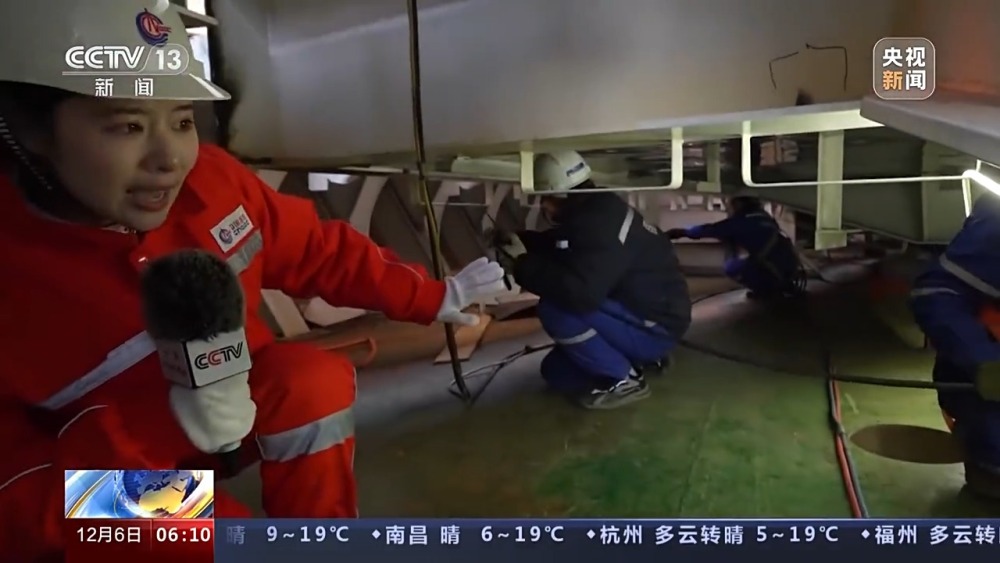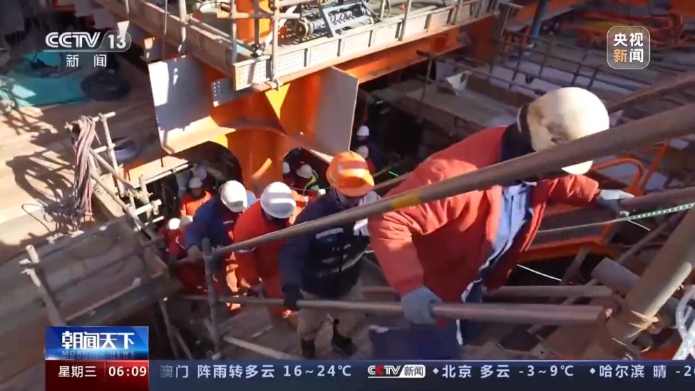 總臺(tái)央視記者 張叢婧:可以看到能源碗里的空間非常狹窄,因?yàn)檫@些模塊由幾十萬個(gè)零部件組成,集成度很高,我們現(xiàn)在進(jìn)一個(gè)施工現(xiàn)場里看一下。工人師傅們正在這里鋪設(shè)電纜,他們都是要蹲著,像這樣挪動(dòng)才能夠完成這些操作。我發(fā)現(xiàn)其實(shí)像這樣的高難度施工,幾乎涉及所有的工種。