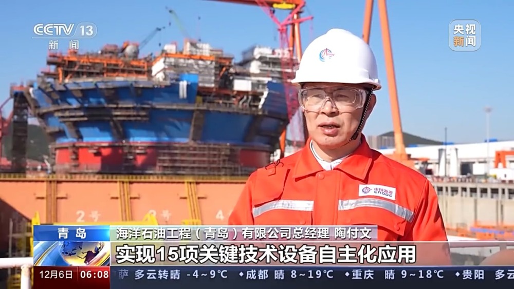 海洋石油工程(青島)有限公司總經(jīng)理 陶付文:創(chuàng)新采用一體化建造工藝和雙龍門吊集成技術(shù),實(shí)現(xiàn)15項(xiàng)關(guān)鍵技術(shù)設(shè)備自主化應(yīng)用,使我國具備了根據(jù)不同油田、不同海域,自主設(shè)計(jì)制造不同類型深水油氣裝備的能力。
