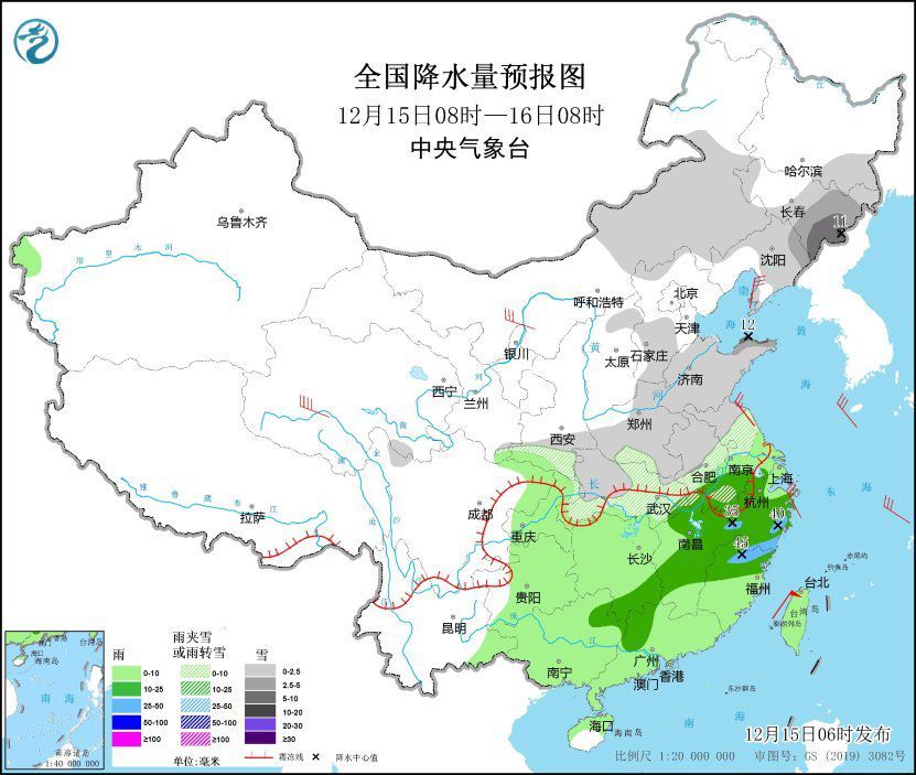 12月15日08時至16日08時,西北地區(qū)東南部、內(nèi)蒙古東部、東北地區(qū)中東部和南部、黃淮、江淮大部、江漢等地部分地區(qū)有小雪或雨夾雪,其中,吉林東部、遼寧東北部、山東北部等地部分地區(qū)有中到大雪,局地暴雪(10~12毫米)。江南、西南地區(qū)東部、華南、臺灣島等地部分地區(qū)有小到中雨,其中,江西北部、浙江中南部、福建北部等地部分地區(qū)有大雨(25~45毫米)。內(nèi)蒙古西南部、遼東半島、江蘇北部等地部分地區(qū)有4~6級風,其中,青海南部部分地區(qū)有6~7級風。