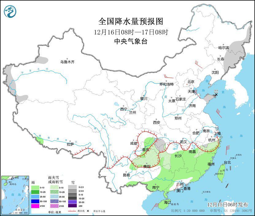 12月16日08時至17日08時,新疆南疆西部山區(qū)、東北地區(qū)東部、山東半島、湖南西部、浙江中部、貴州等地部分地區(qū)有小雪或雨夾雪,其中,山東半島等地部分地區(qū)有中到大雪,局地暴雪或大暴雪(20~22毫米)。湖南東部和南部、江西大部、浙江南部、福建、華南大部、臺灣島等地部分地區(qū)有小雨。內(nèi)蒙古中東部、山東北部、廣東西南部沿海等地部分地區(qū)有4~6級風。