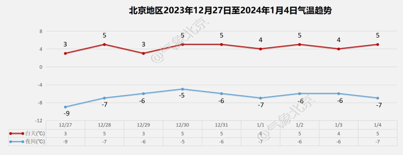北京地區(qū)2023年12月27日至2024年1月4日氣溫趨勢。圖/北京市氣象臺