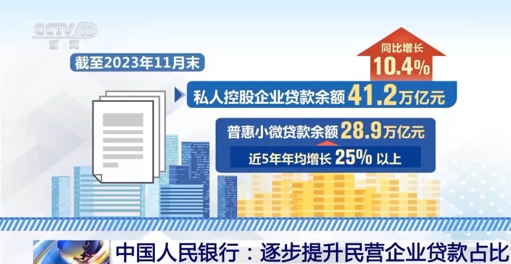 在信貸政策方面,開展中小微企業(yè)金融服務能力提升工程,完善金融服務體系,增強民營貸款的穩(wěn)定性。截至2023年11月末,私人控股企業(yè)貸款余額41.2萬億元,同比增長10.4%;普惠小微貸款余額28.9萬億元,近5年年均增長25%以上。