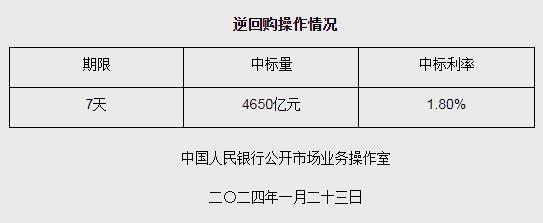 中新網(wǎng)1月23日電 據(jù)央行網(wǎng)站消息,為維護銀行體系流動性合理充裕,2024年1月23日人民銀行以利率招標(biāo)方式開展了4650億元逆回購操作,中標(biāo)利率1.80%,期限為7天。具體情況如下: