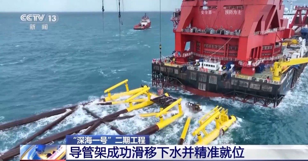 中國(guó)海油“深海一號(hào)”二期工程導(dǎo)管架海上安裝首席 黎世龍:“深海一號(hào)”二期工程導(dǎo)管架海上安裝采用滑移下水方式進(jìn)行。這種方式是利用導(dǎo)管架自身重力并配合液壓千斤頂助推,使導(dǎo)管架從駁船平穩(wěn)地滑入海中,再通過起重船將導(dǎo)管架吊裝扶正坐底,從而實(shí)現(xiàn)安裝就位。