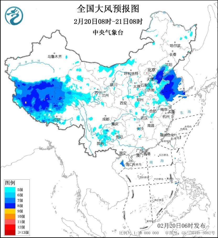 預(yù)計(jì),2月20日8時(shí)至21日8時(shí),西藏中西部、青海中南部、內(nèi)蒙古中西部、遼寧南部、華北東南部、黃淮西部和東部、江淮西部和北部等地的部分地區(qū)有5至7級(jí)風(fēng),陣風(fēng)8至9級(jí)。渤海、渤海海峽、黃海大部海域?qū)⒂?至8級(jí),陣風(fēng)9至10級(jí)的大風(fēng)。