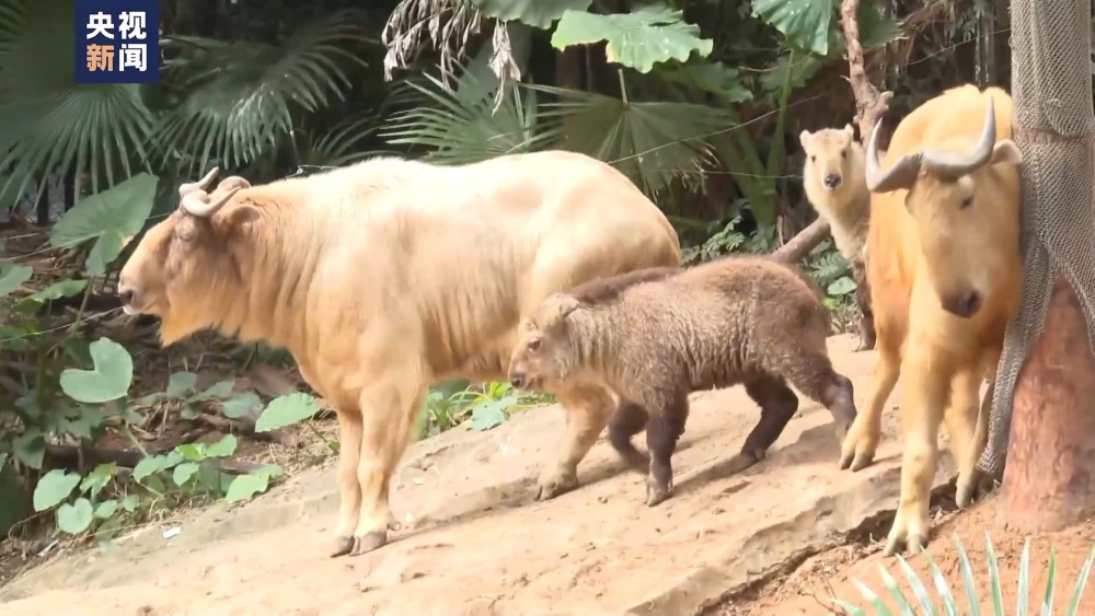 金毛羚牛是我國一級保護動物。近日,在廣州長隆野生動物世界,一對雙胞胎金毛羚牛幼崽跟隨媽媽順利回到族群。