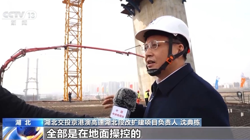 湖北交投京港澳高速湖北段改擴(kuò)建項(xiàng)目負(fù)責(zé)人 沈典棟:這個(gè)塔頂上就是輕型智能筑塔機(jī),是采用智能建造的技術(shù),全都是在地面操控的,塔上無(wú)人,這樣就保證了我們工人安全。我們這個(gè)智能的布料系統(tǒng),布料很均勻,讓混凝土不產(chǎn)生離析。