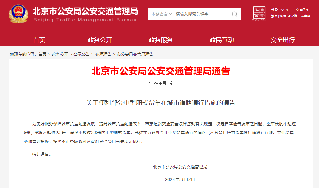 為更好服務(wù)保障城市貨運(yùn)配送發(fā)展,提高城市貨運(yùn)配送效率,根據(jù)道路交通安全法律法規(guī)有關(guān)規(guī)定,決定自本通告發(fā)布之日起,整車長度不超過6米、寬度不超過2.2米、高度不超過2.8米的中型廂式貨車,允許在五環(huán)外禁止中型貨車通行的道路(不含禁止所有貨車通行道路)行駛。其他貨車交通管理措施,按照本市各級政府及政府其他部門有關(guān)規(guī)定執(zhí)行。