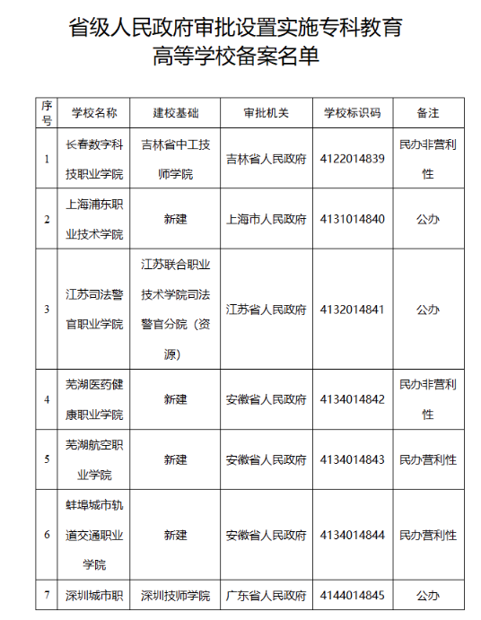 央廣網(wǎng)北京3月25日消息(記者馮儀) 近日,教育部根據(jù)《中華人民共和國高等教育法》《普通高等學(xué)校設(shè)置暫行條例》等有關(guān)法律法規(guī)和政策文件的規(guī)定,將省級人民政府審批新設(shè)的??茖哟胃叩葘W(xué)校備案名單予以公布。