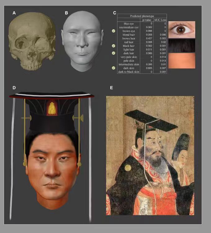 復旦大學科技考古研究院文少卿團隊用專門適用于古DNA的捕獲探針,從北周武帝肢骨樣本上獲取了約100萬個可用的基因位點,還原北周武帝頭發(fā)、皮膚、瞳孔等關(guān)鍵特征。經(jīng)過6年的反復嘗試,終于“描繪”出宇文邕頭像。