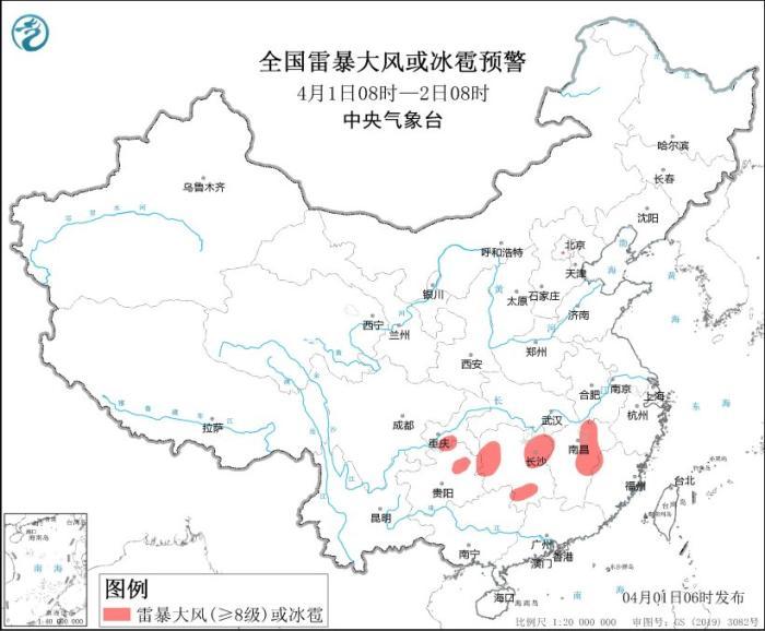 全國雷暴大風或冰雹預警(4月1日08時-2日08時)