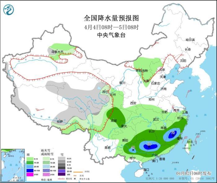 4月3日08時至4日08時,新疆北疆北部和伊犁河谷沿天山一帶、西藏北部、青海東北部和南部、甘肅河西、川西高原北部、黑龍江東部等地部分地區(qū)有小到中雪或雨夾雪。江南中南部、西南地區(qū)東北部、華南北部等地部分地區(qū)有中到大雨,其中,湖南西南部、江西中部、廣西東北部、廣東西北部等地部分地區(qū)有暴雨或大暴雨(100~110毫米)。內(nèi)蒙古河套地區(qū)和中部、新疆沿天山地區(qū)、西藏南部等地部分地區(qū)有4~5級風(fēng)。