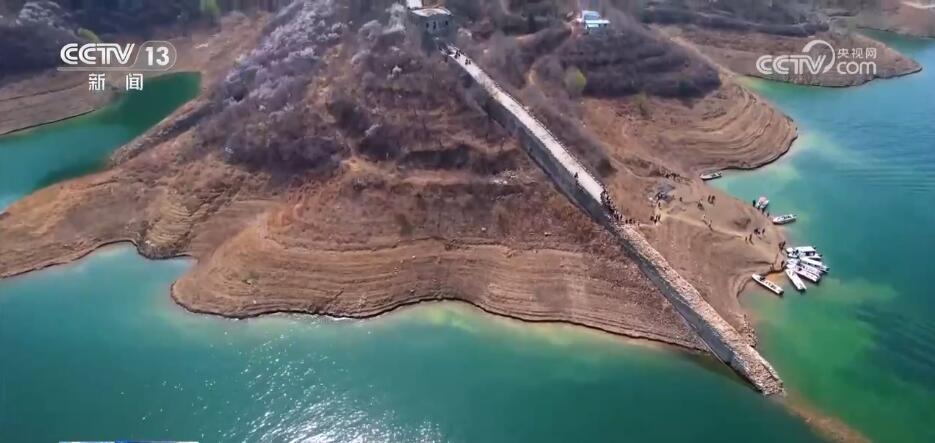 您現(xiàn)在看到的是位于河北省寬城滿族自治縣境內(nèi)的潘家口水庫“水下長(zhǎng)城”。長(zhǎng)城內(nèi)外,漫山遍野的山杏花悄然綻放,在春風(fēng)中爭(zhēng)芳斗艷,時(shí)而飄來陣陣花香。春日里,盛開的杏花、碧綠的湖水與巍峨的長(zhǎng)城交相輝映,形成了剛?cè)嶂赖耐昝廊诤?,?gòu)成一幅絕美的畫卷,吸引了眾多游客登上長(zhǎng)城前來賞花踏青。