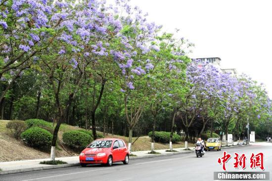5月12日,成都市武侯區(qū)晉陽街道晉吉社區(qū)武晉路上600株藍花楹全部綻放,造就了一條長約1700米的藍花楹長廊,浪漫紫色花海美出了天際。安源 攝