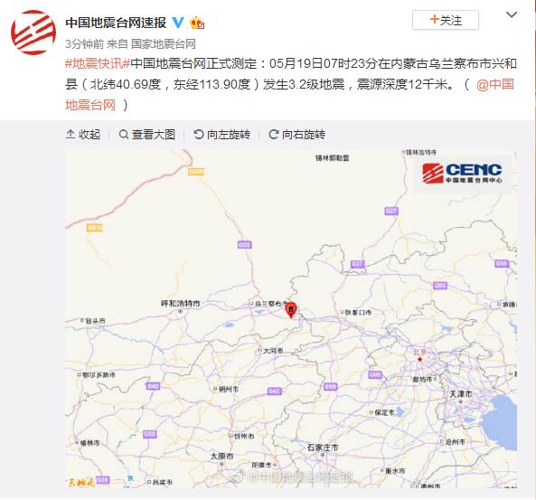 內(nèi)蒙古烏蘭察布市興和縣發(fā)生3.2級(jí)地震 震源深度12千米