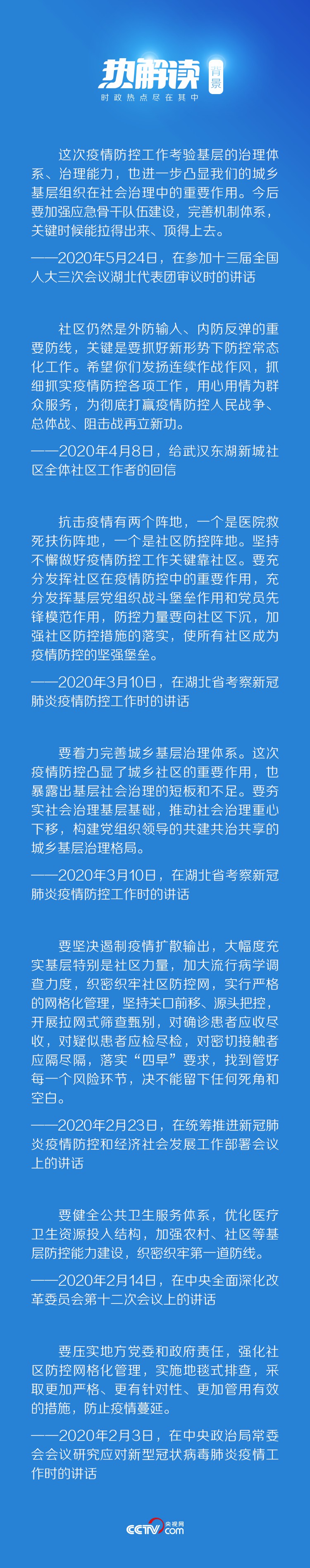 習(xí)近平在后來的講話中強(qiáng)調(diào),要“堅(jiān)持常態(tài)化精準(zhǔn)防控和局部應(yīng)急處置有機(jī)結(jié)合,加強(qiáng)社區(qū)精準(zhǔn)防控”,“健全疾控機(jī)構(gòu)與城鄉(xiāng)社區(qū)聯(lián)動工作機(jī)制,加強(qiáng)鄉(xiāng)鎮(zhèn)衛(wèi)生院和社區(qū)衛(wèi)生服務(wù)中心疾病預(yù)防控制職責(zé),夯實(shí)聯(lián)防聯(lián)控的基層基礎(chǔ)”。