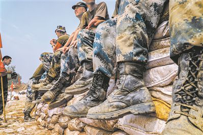 7月20日,在筑壩固堤任務中,年輕官兵們的戰(zhàn)靴沾滿泥土。謝程宇 攝
