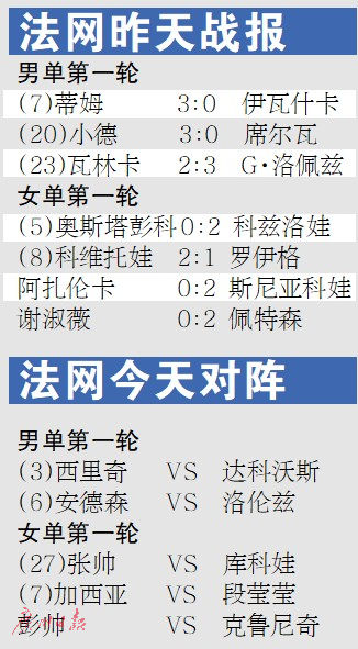 前賽會冠軍瓦林卡止步法網(wǎng)首輪