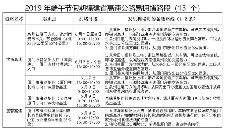人民網(wǎng)福州6月5日電(余杉芳)來自福建省公安廳交警總隊(duì)的消息,2019年端午節(jié)假期為6月7日至9日,恰逢全國高考期間,相比清明、五一等節(jié)假日,高速公路網(wǎng)運(yùn)行壓力較小,但車流量較平時(shí)會(huì)有明顯增加,部分路段車流量“潮汐”現(xiàn)象明顯。交警總隊(duì)發(fā)布了端午節(jié)假期福建各地高速行車安全提示,同時(shí)公布高速公路危險(xiǎn)和事故多發(fā)點(diǎn)段有18個(gè)、易擁堵路段有13個(gè),管制路段有1個(gè)。