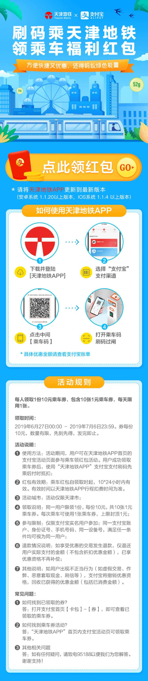 1.乘客可在6月27日至7月6日期間,打開“天津地鐵APP”首頁的支付寶活動頁面跳轉(zhuǎn)至支付寶APP,領(lǐng)取一份支付寶紅包,每份紅包內(nèi)含10張1元乘車券,共10元優(yōu)惠金額。