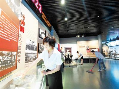 在安平縣臺城村全國第一個農(nóng)村黨支部紀念館內(nèi),工作人員正在擦拭展臺。 記者 焦 磊攝
