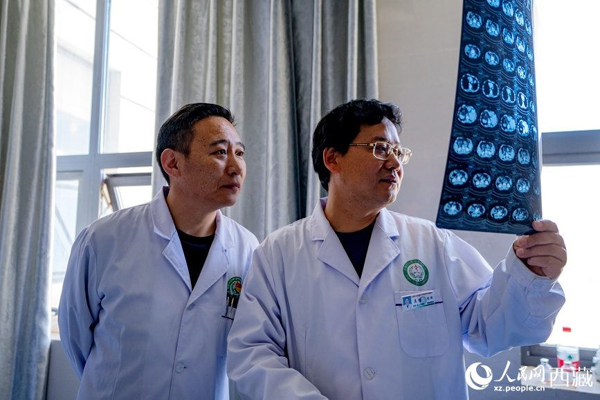 吳維(右一)和強(qiáng)巴旦增(右二)在查看患者的影像資料。人民日?qǐng)?bào)記者 徐馭堯攝