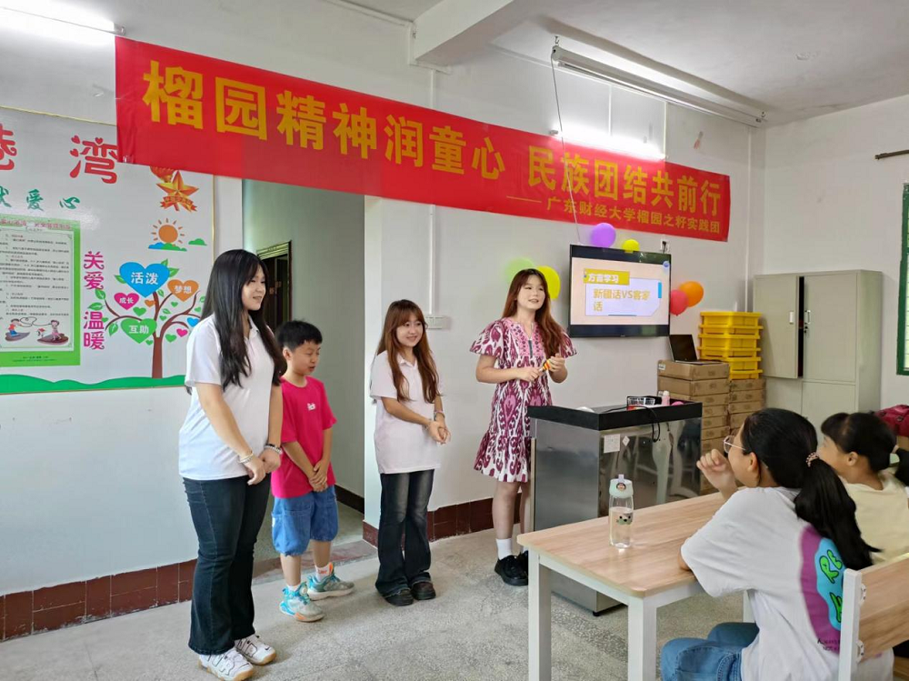 7月7日-7月13日,廣東財經(jīng)大學“榴園之籽”實踐團組織了廣財大的各民族精英大學生到興寧市開展鄉(xiāng)村支教活動,隊員們教授民族特色歌舞、繪畫手工、武術體育和勞動教育等內(nèi)容,助力兒童德智體美勞全面發(fā)展。隊員們還為兒童展示各民族的文化特色,讓他們感受到不同民族文化的魅力,并通過講述廣東人民援疆、援藏的事跡,特別是“榴園”校友黃海芬扎根西藏奉獻的事跡,引導孩子們鑄牢中華民族共同體意識。隊員們在支教中傳遞“榴園精神”,鼓勵孩子們一起學習“凝心聚力、團結奮斗”的“榴園精神”,激勵他們勤奮向?qū)W、學會感恩,長大成才后回饋家鄉(xiāng)和社會。
