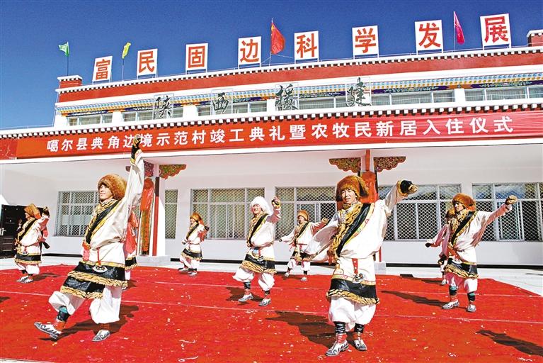 2012年10月,陜西省援建的阿里地區(qū)首個(gè)邊境小康示范村——噶爾縣扎西崗鄉(xiāng)典角村竣工。這是入住儀式上,群眾跳起歡快的舞蹈。